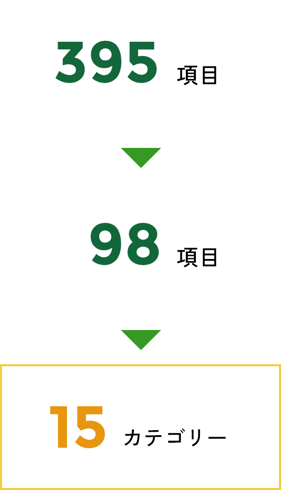 395項目の検討課題について、「富士急グループにおける重要性」と「社会における重要性」によって評価を行い、類似課題の統合や関連性などを鑑みて98項目に絞り込み、15のカテゴリーに集約しました。